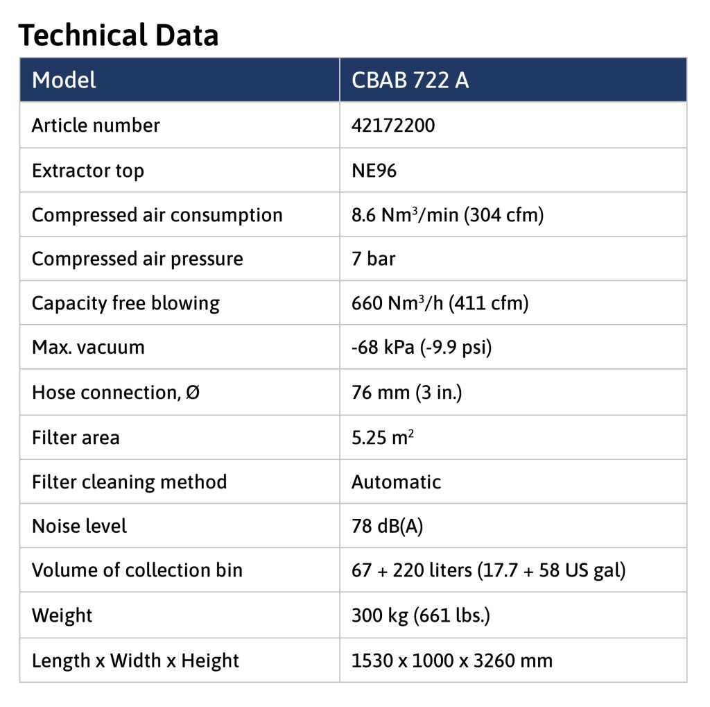The 722A is an extremely powerful industrial vacuum unit engineered for the collection of blasting grit and other granular materials. With a combination of high vacuum and high airflow, it ensures efficient material transport over long distances.